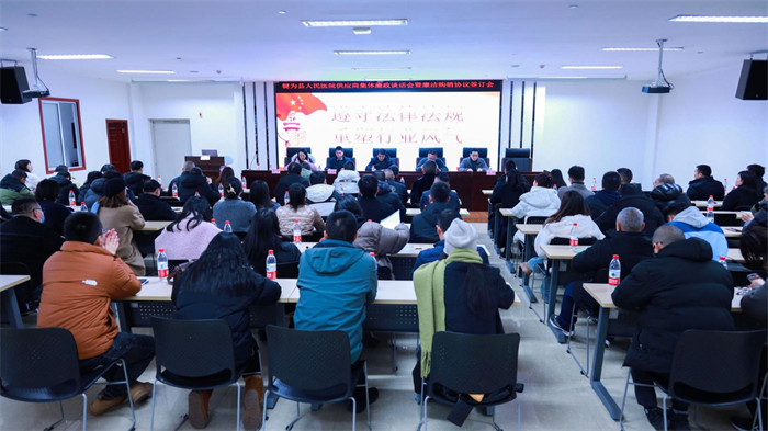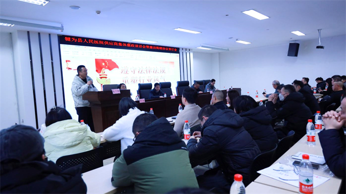 12月30日下午,犍为县人民医院召开药品、耗材、后勤物资供应商集体廉政谈话会暨廉洁购销协议签订会, 医院班子成员,纪检监察室、药剂科、医学装备科、后勤保障科相关人员,医院药品、耗材及后勤物资供应商共一百余人参会。会议由医院党委委员、纪委书记邓雯主持。