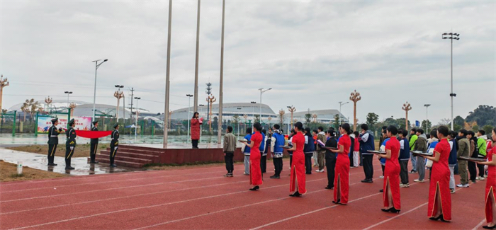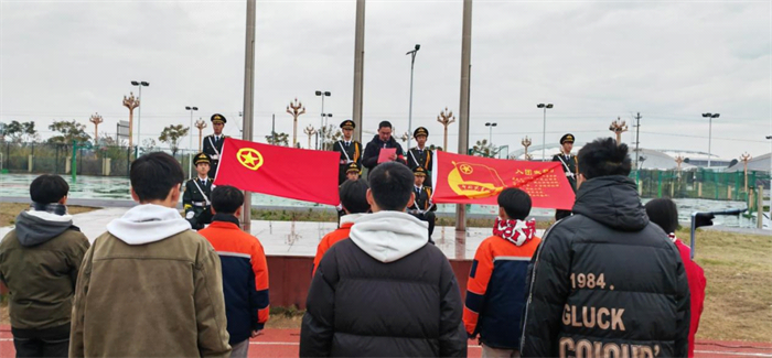 新团员们身姿挺拔,步伐坚定有力,个个精神抖擞,有序入场。与此同时,团仪仗队成员迈着整齐划一的正步,护送团旗缓缓前行,在庄重且神圣的氛围中,团旗飘扬而出,熠熠生辉。