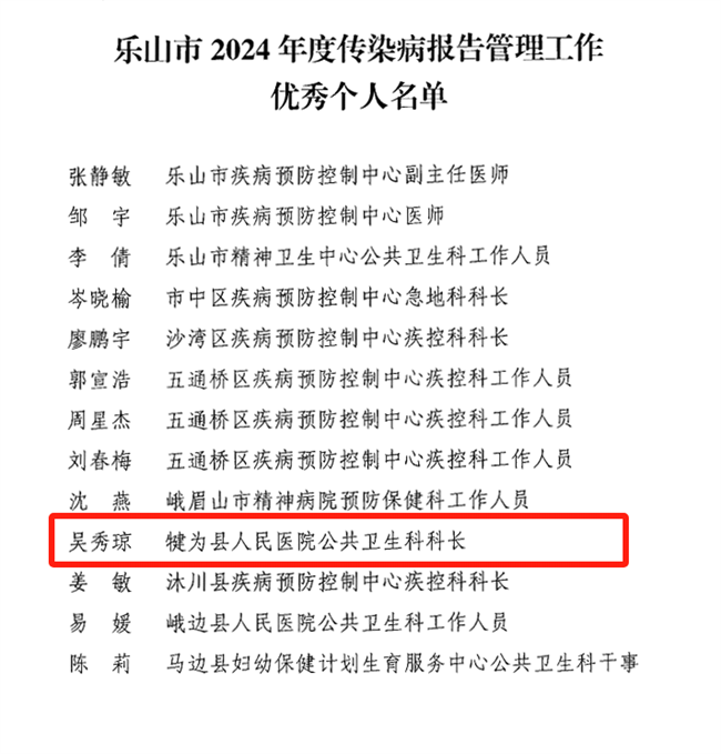 近日,乐山市卫生健康委员会组织对各县(市、区)疾控机构和医疗机构传染病报告管理工作开展两轮次的综合评估,根据综合评分情况,犍为县人民医院获评“乐山市2024年度传染病报告管理工作优秀单位”,医院公共卫生科科长吴秀琼在传染病报告管理工作中表现突出被评为“乐山市2024年度传染病报告管理工作优秀个人”。
