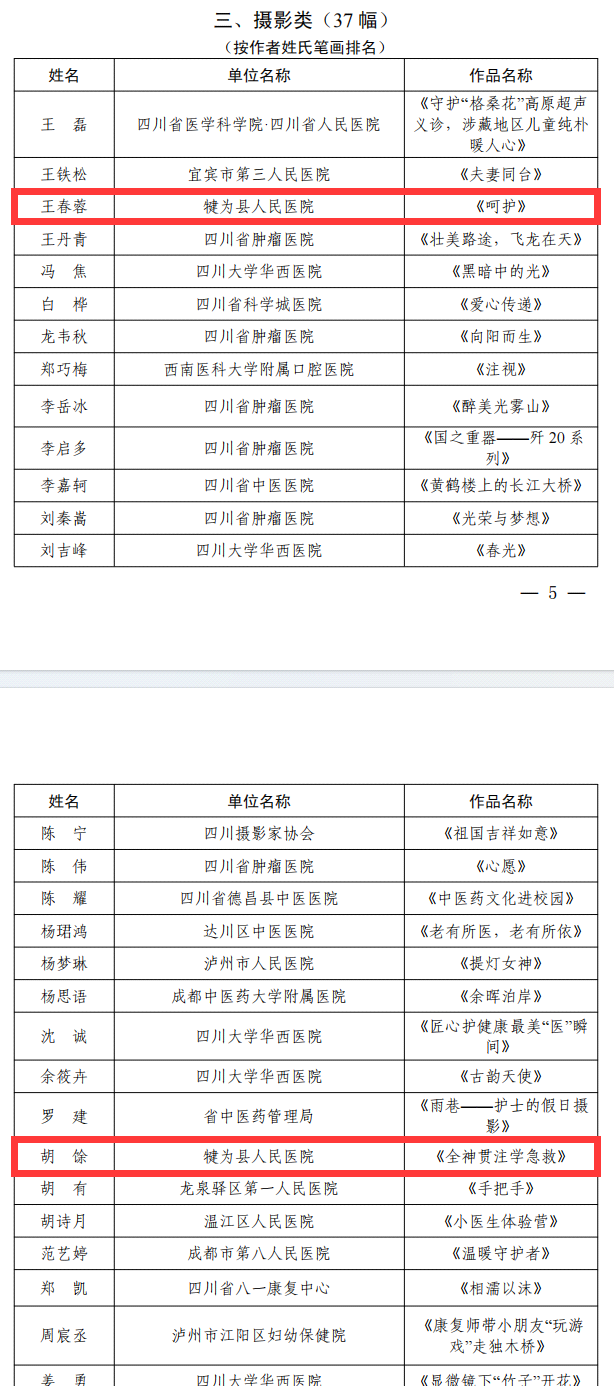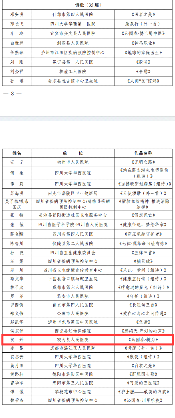 近日,由四川省卫生健康委组织开展的2024年全系统“奋进新征程 共绘健康路”文艺作品征集活动名单公布,犍为县人民医院报送作品《呵护》《全神贯注学急救》《沁园春•犍为》脱颖而出,入选“奋进新征程 共绘健康路”优秀文艺作品名单。