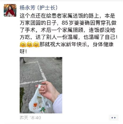 手术室内,气氛紧张而凝重;无影灯下,王盾与梁荣飞争分夺秒,谨慎操作,成功为余奶奶修补穿孔胃肠,手术取得圆满成功。术后,余奶奶被送回外科病房,护理团队在护士长杨永芳带领下,悉心照料,每一个环节都体现了医护人员的专业与细心。杨永芳看到余奶奶家属因担心病情没吃晚饭,下班后还从家中提来热饭,让家属十分感动。他们深知,在这段艰难的日子里,医护人员不仅是余奶奶生命的守护者,更是他们心灵的慰藉。