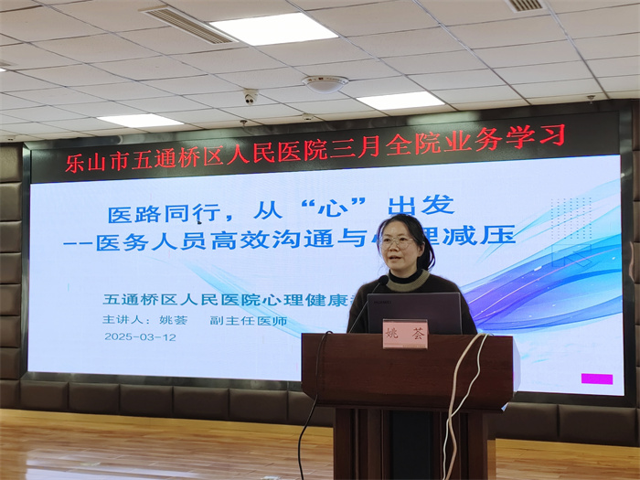 为进一步缓解医务人员工作压力,提高自我心理调节能力,改善心理健康水平,营造高效沟通、积极健康向上的工作环境。3月12日下午,乐山市五通桥区人民医院开展心理健康专题讲座,特邀乐山市五通桥区精神病医院副主任医师、中级心理治疗师姚荟前来授课。全院医务人员共计140人参加本次讲座。