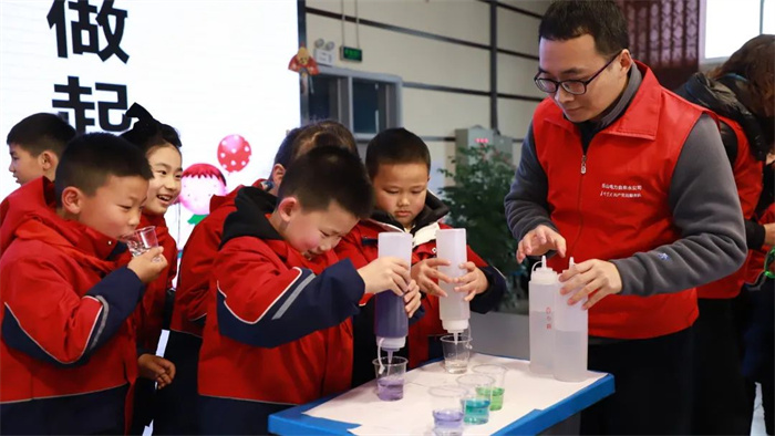 在星空间剧场,乐山电力自来水公司工作人员通过视频、图文,跟孩子们一起探索了水的奇妙形态、中国水资源的秘密,自来水是怎么“出生”的!讲解生动有趣,学习变得像玩游戏一样轻松;紫甘蓝水大变身实验让孩子们惊呼连连。透明的液体一遇到紫甘蓝的花青色,瞬间变成了绿色、粉色、紫色、蓝色……简直像变魔术一样。科学的种子就这样悄悄在孩子们心里发芽。